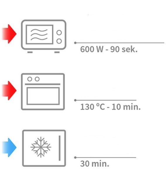 Vankúšik na zahriatie vložte do mikrovlnnej rúry (600 W / cca 90 sekúnd), rúry (130 ° cca 10 min.) alebo iného zdroja tepla, napr. radiátora.